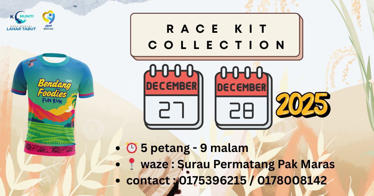 - Pengambilan kit larian perlu dibuat pada 27 & 28 December 2025 , 5:00pm - 9:00pm di Surau Pmtg Pak Maras.